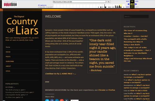 Posted in General, tagged aspd, blog, country of liars, country of liars archive, country of liars blog, larry, narcissism, npd, psychopathy, sociopathy, wayback machine on August 2, 2017| Leave a Comment »