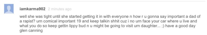 “On one hand it [iamkarma902] could have been the male in the photo giving a thumbs up and smiling as he rapes Rehtaeh. It was his YouTube account the threat was associated with and the IP went to his house, but was he the one who typed it? Maybe? Maybe not?” http://glencanning.com/2015/06/death-threat-charges-dropped/
